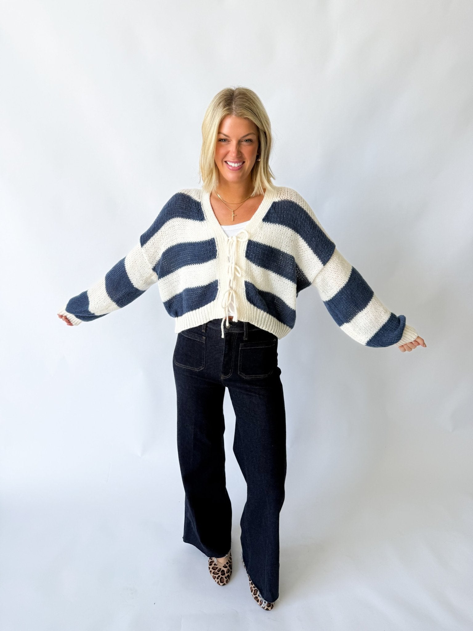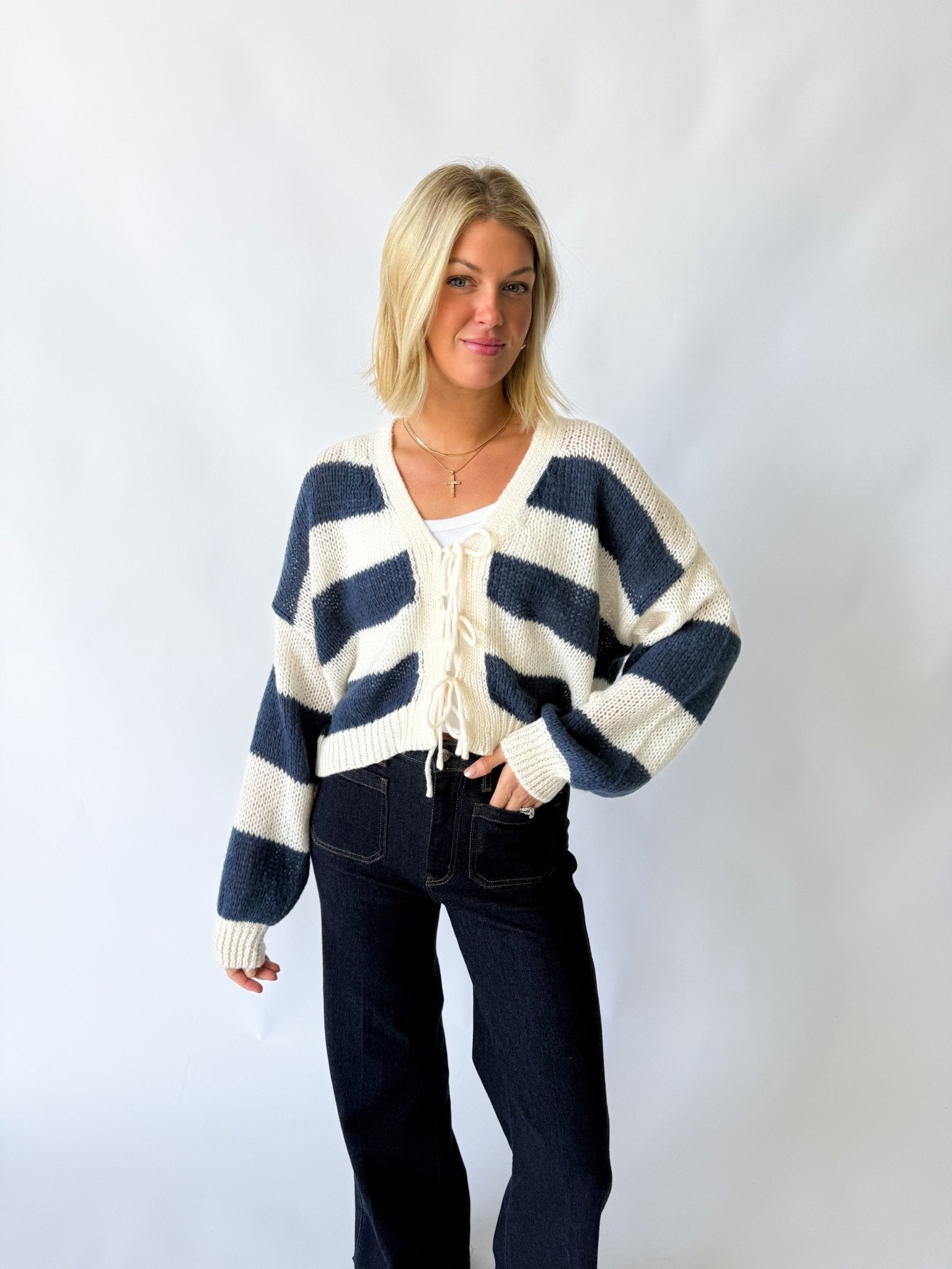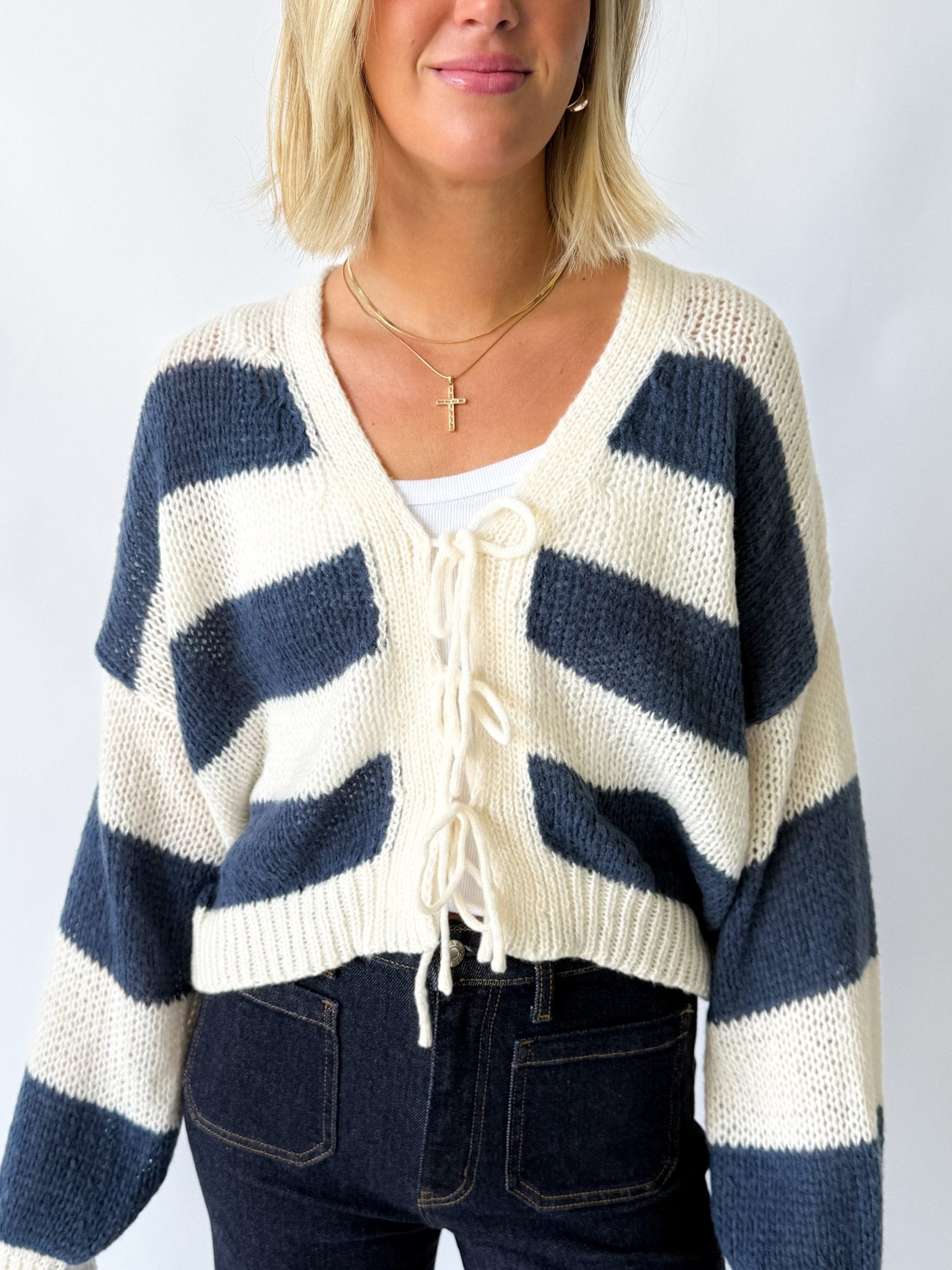 Chunky rib knit; lace-up tie front; relaxed drop-shoulder fit; cropped length.