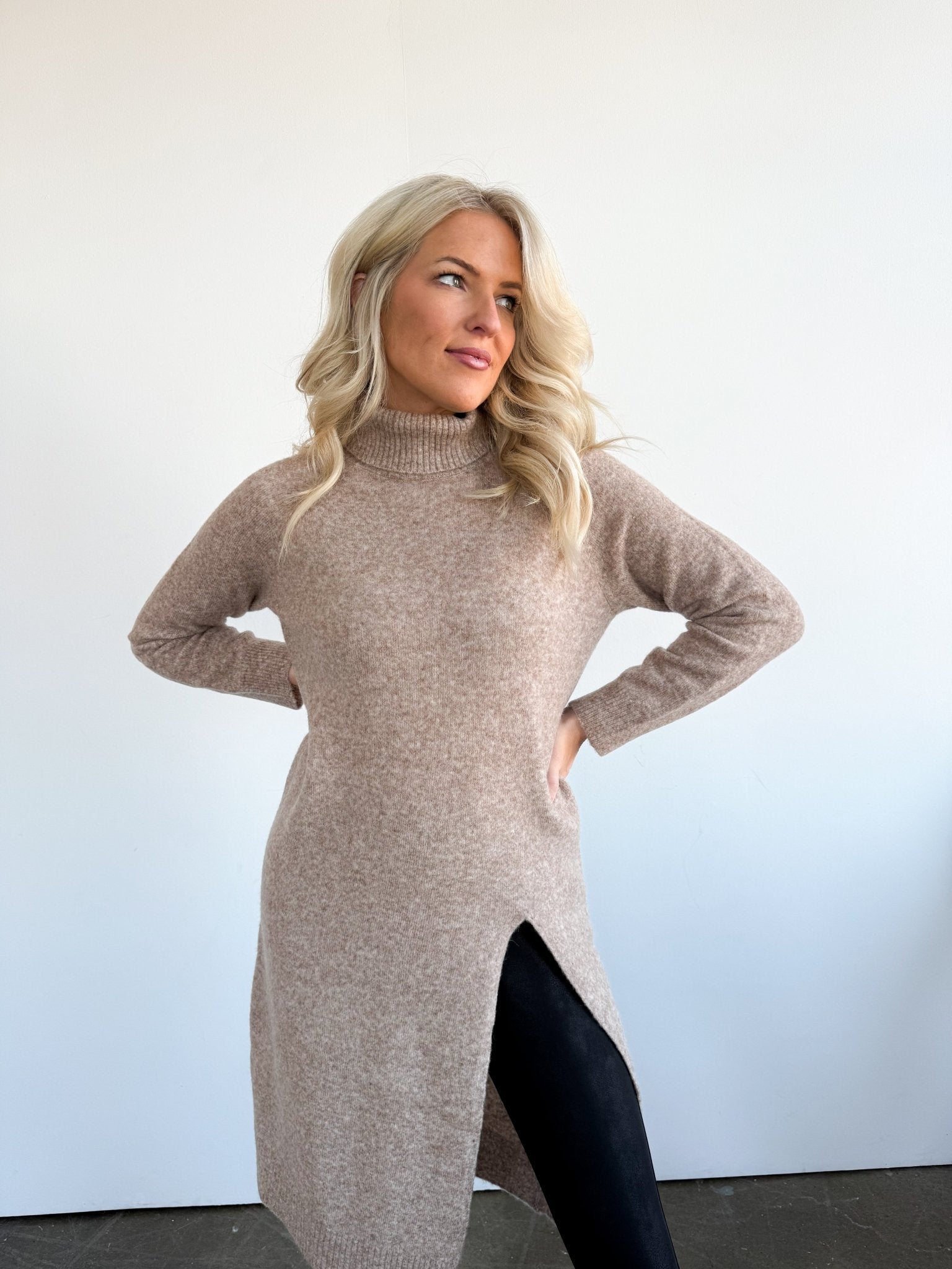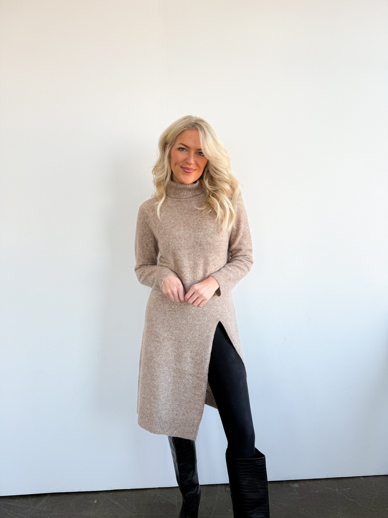 Rowan is designed with a relaxed, tunic-length silhouette that flatters without overwhelming. The longer length provides coverage through the hips and thighs, while the side slit adds shape and movement. True to size with an intentionally easy fit—perfect over leggings or slim denim.