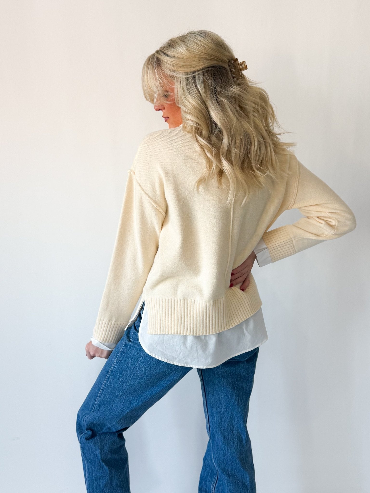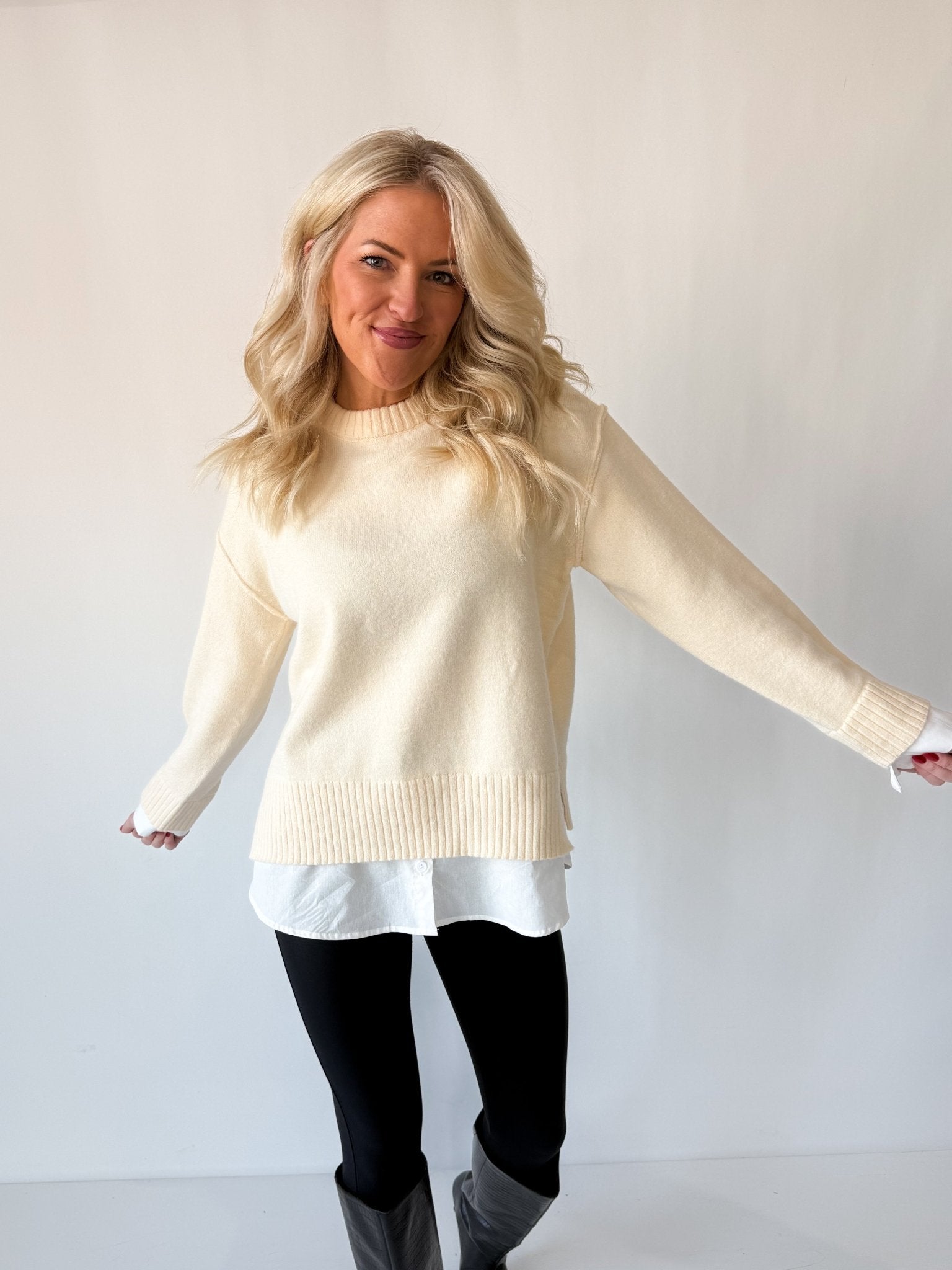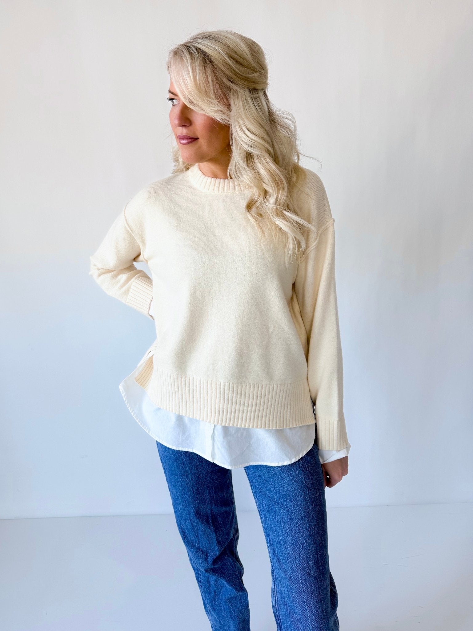 Everly has a relaxed, easy fit through the body with a slightly structured ribbed hem that keeps it from feeling oversized. Designed to skim—not cling—this top is forgiving through the midsection and flattering on a range of body types. True to size for a polished, layered look. Size up if you prefer a slouchier fit.