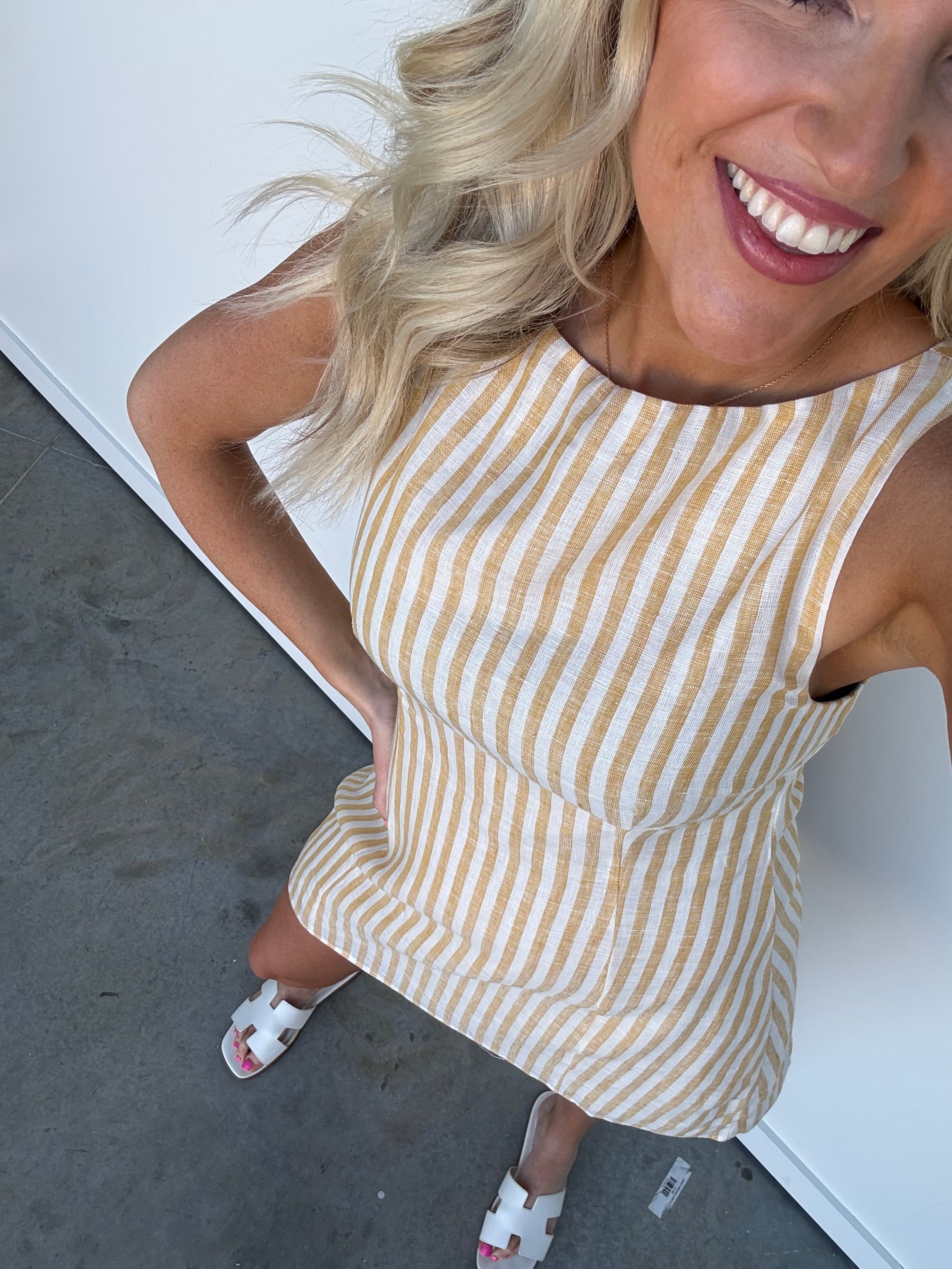 Vertical stripes provide a lengthening effect, while the structured bodice keeps the dress flattering without feeling restrictive.